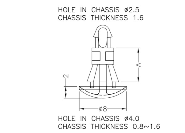 Reverse mount PCB spacer. Cupped design minimizes dust ingress and protrusion on chassis bottom. Teardrop snap fit for panel hole of 2.5 mm. Snap in fixation for chassis hole diameter of 4 mm. Spacer length 11.1 mm.