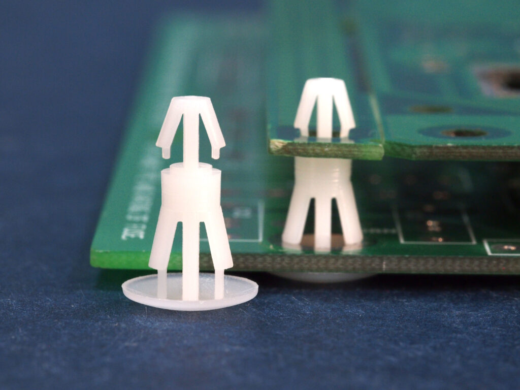 Reverse mount PCB spacer. Cupped design minimizes dust ingress and protrusion on chassis bottom. Arrowhead fits panel hole of 4 mm. Snap in fixation for chassis hole diameter of 5.5 mm. Spacer length 3.5 mm.