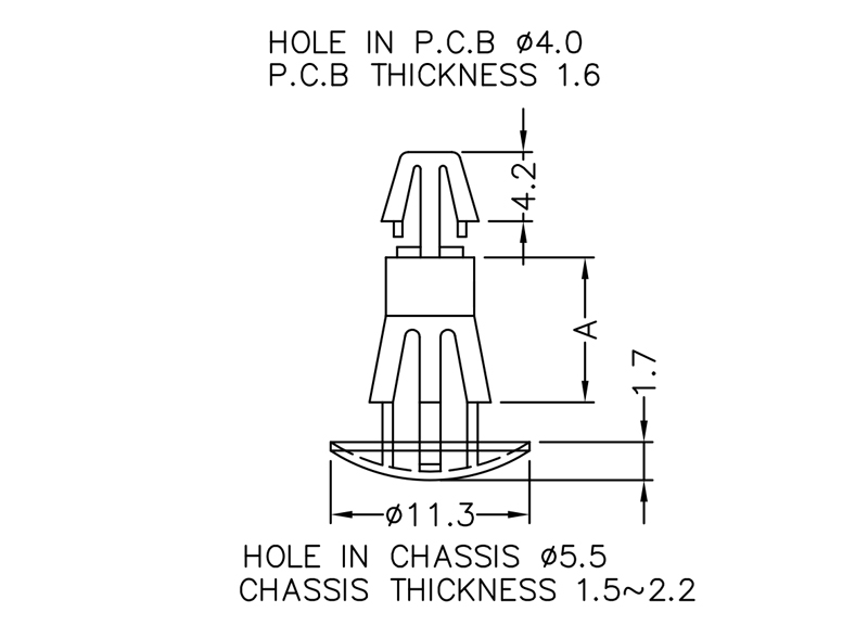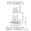Reverse mount PCB spacer. Cupped design minimizes dust ingress and protrusion on chassis bottom. Arrowhead fits panel hole of 4 mm. Snap in fixation for chassis hole diameter of 5.5 mm. Spacer length 8 mm.