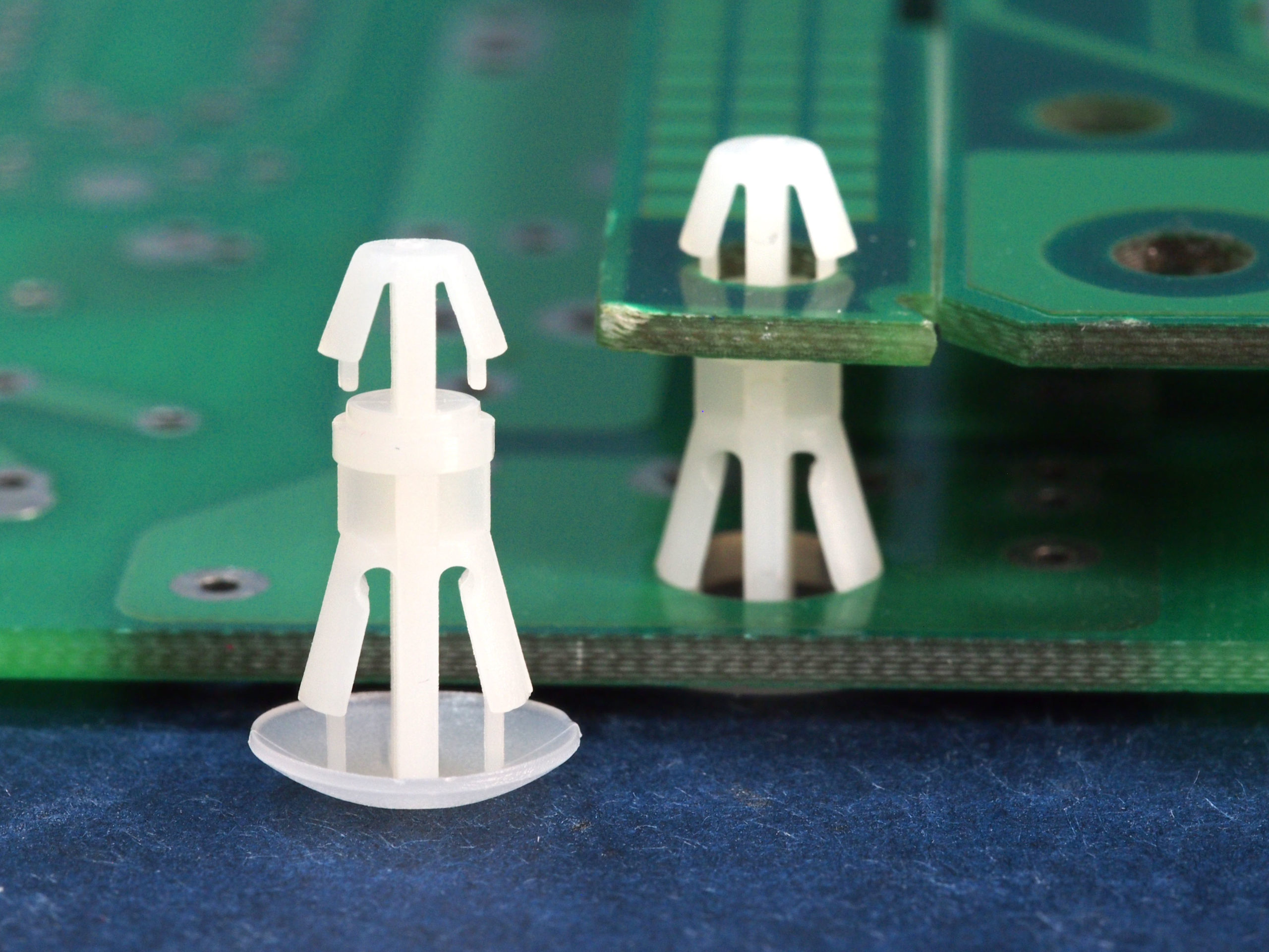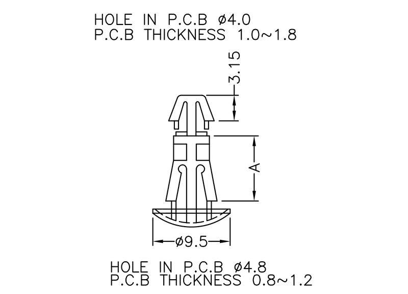 Reverse mount PCB spacer. Cupped design minimizes dust ingress and protrusion on chassis bottom. Arrowhead fits panel hole of 4 mm. Snap in fixation for chassis hole diameter of 4.8 mm. Spacer length 6.3 mm.