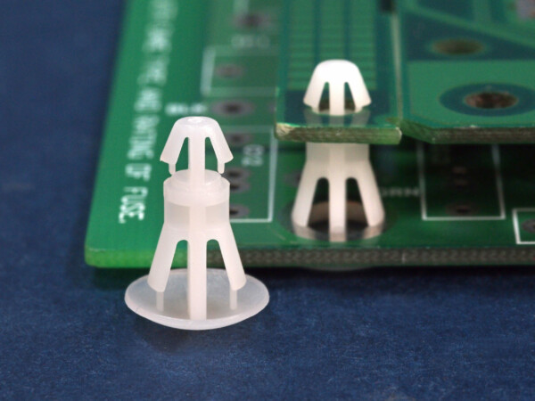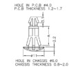 Reverse mount PCB spacer. Cupped design minimizes dust ingress and protrusion on chassis bottom. Arrowhead fits panel hole of 4 mm. Snap in fixation for chassis hole diameter of 6 mm. Spacer length 15.9 mm.