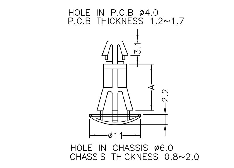 Reverse mount PCB spacer. Cupped design minimizes dust ingress and protrusion on chassis bottom. Arrowhead fits panel hole of 4 mm. Snap in fixation for chassis hole diameter of 6 mm. Spacer length 5 mm.