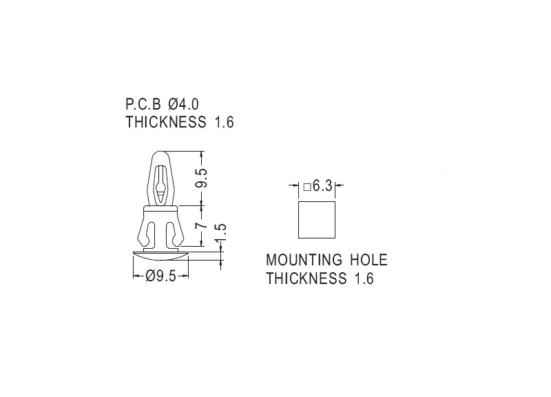 Reverse mount PCB spacer. Cupped design minimizes dust ingress and protrusion on chassis bottom. Bayonet snap fit for panel hole of 4 mm. Snap in fixation for chassis hole diameter of 6.3 mm. Spacer length 7 mm.