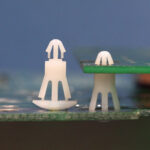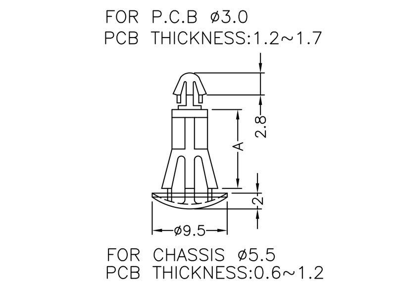 Reverse mount PCB spacer. Cupped design minimizes dust ingress and protrusion on chassis bottom. Arrowhead fits panel hole of 3 mm. Snap in fixation for chassis hole diameter of 5.5 mm. Spacer length 8 mm.