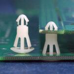 Reverse mount PCB spacer. Cupped design minimizes dust ingress and protrusion on chassis bottom. Arrowhead fits panel hole of 3.5 mm. Snap in fixation for chassis hole diameter of 5.5 mm. Spacer length 10 mm.