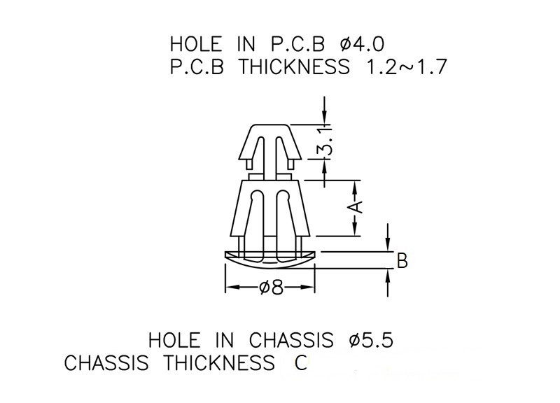 Reverse mount PCB spacer. Cupped design minimizes dust ingress and protrusion on chassis bottom. Arrowhead fits panel hole of 4 mm. Snap in fixation for chassis hole diameter of 5.5 mm. Spacer length 5 mm.