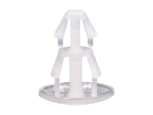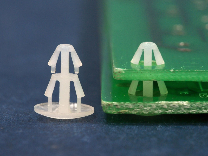Reverse mount PCB spacer. Cupped design minimizes dust ingress and protrusion on chassis bottom. Arrowhead fits panel hole of 3.2 mm. Snap in fixation for chassis hole diameter of 4 mm. Standoff height 2.8 mm.