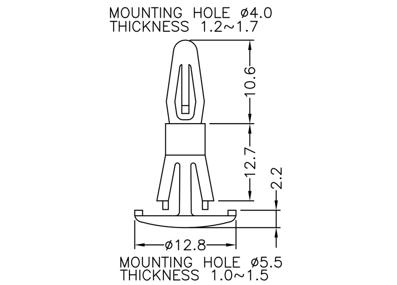 Reverse mount PCB spacer. Flat design minimizes protrusion on chassis bottom. Bayonet snap fit for panel hole of 4 mm. Snap in fixation for chassis hole diameter of 5.5 mm. Spacer length 12.7 mm.