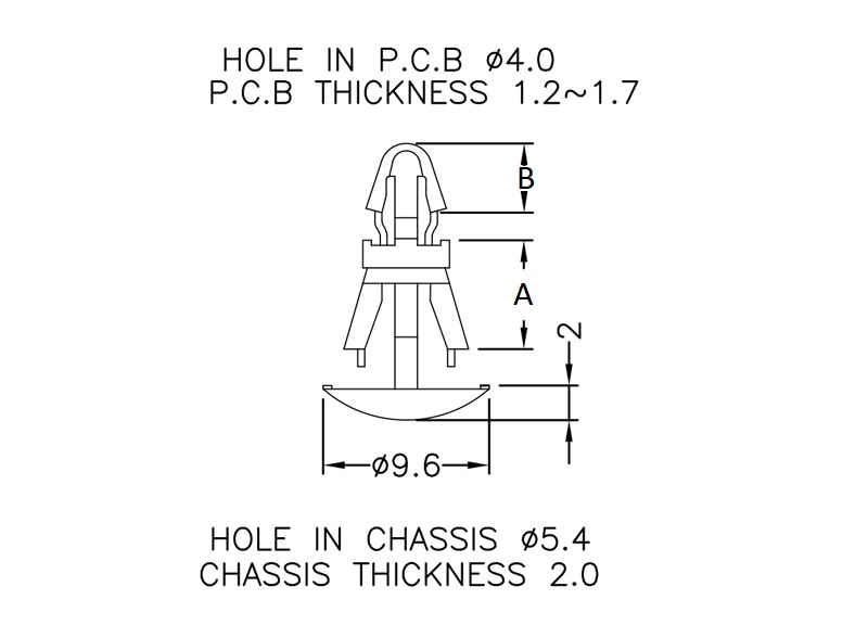Reverse mount PCB spacer. Cupped design minimizes dust ingress and protrusion on chassis bottom. Arrowhead fits panel hole of 4 mm. Snap in fixation for chassis hole diameter of 5.4 mm. Spacer length 12 mm.