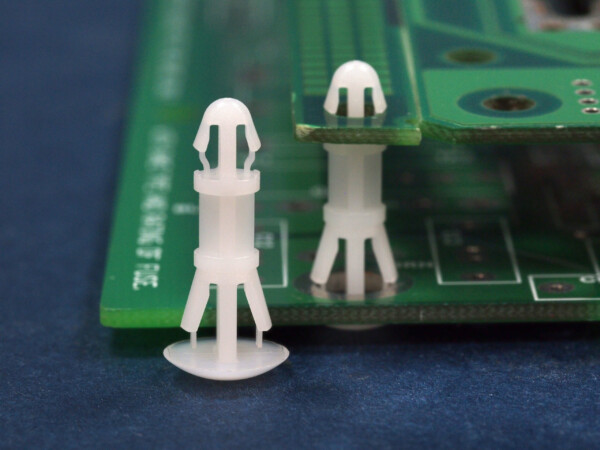 Reverse mount PCB spacer. Cupped design minimizes dust ingress and protrusion on chassis bottom. Arrowhead fits panel hole of 4 mm. Snap in fixation for chassis hole diameter of 5.4 mm. Spacer length 6.3 mm.