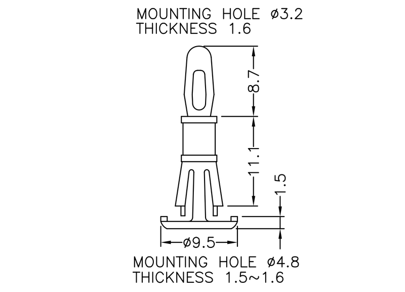 Reverse mount PCB spacer. Flat design minimizes protrusion on chassis bottom. Bayonet snap fit for panel hole of 3.2 mm. Snap in fixation for chassis hole diameter of 4.8 mm. Spacer length 11.1 mm.