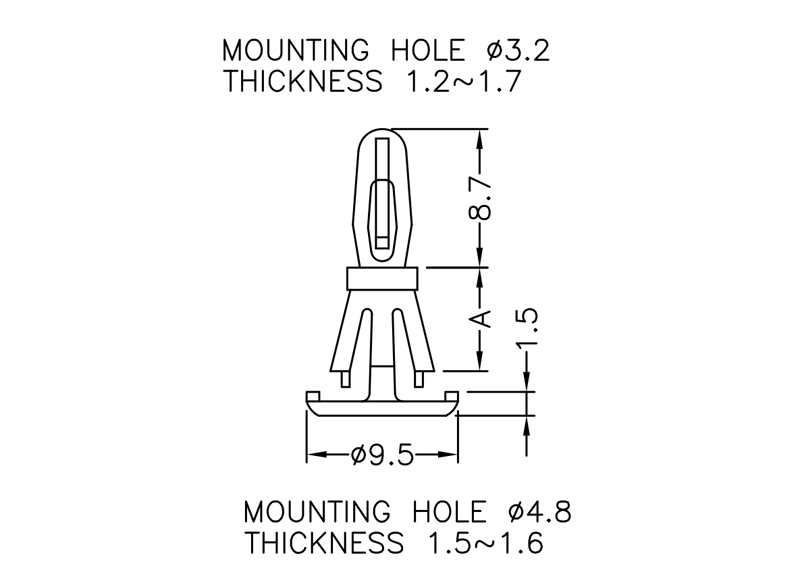 Reverse mount PCB spacer. Flat design minimizes protrusion on chassis bottom. Bayonet snap fit for panel hole of 3.2 mm. Snap in fixation for chassis hole diameter of 4.8 mm. Spacer length 14.3 mm.