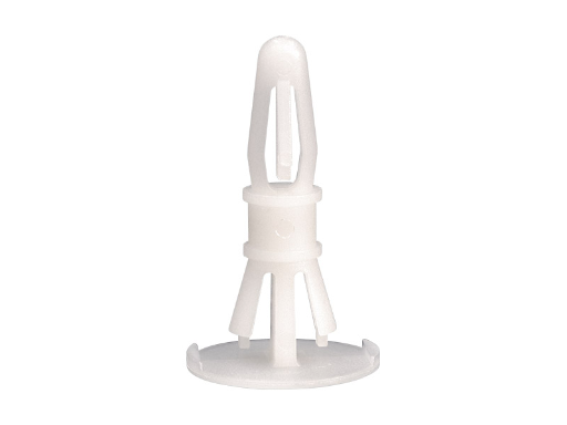 Reverse mount PCB spacer. Flat design minimizes protrusion on chassis bottom. Bayonet snap fit for panel hole of 4 mm. Snap in fixation for chassis hole diameter of 5.4 mm. Standoff height 9.5 mm.