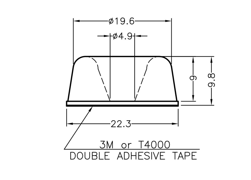 Recessed Self-Adhesive Rubber Bumper Ø22.3×9.8mm. The central cavity adds strength for high-impact use and allows for permanent attachment with nails or staples. These bumpers are often used on music equipment