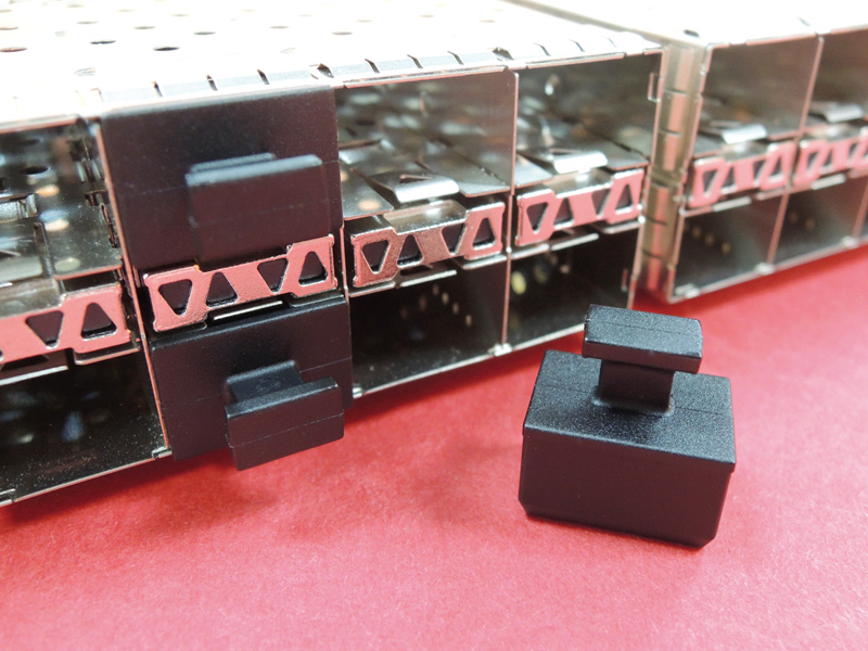 Small Form Pluggable (SFP) Optical Port Cover with Pull Tab. Material Polyethylene. Color Black.