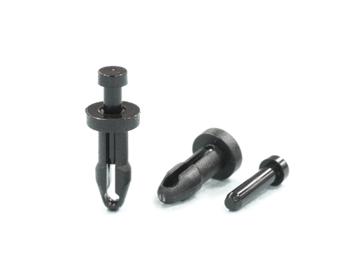 Two-piece Soft Fan Mount Pin. Hole in Fan dia. Ø 2.5-2.6mm. Thickness 4.0-4.5mm. Material Nylon 66. Color Black. This rivet has extendable legs that lock components into place with a simple push. No tools required.