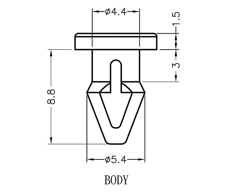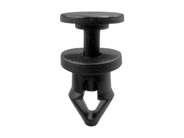 Two-piece Soft Fan Mount Pin. Hole in Fan dia. Ø 4.4mm. Thickness 3.0mm. Material TPU. Color Black. This rivet has extendable legs that lock components into place with a simple push. No tools required.
