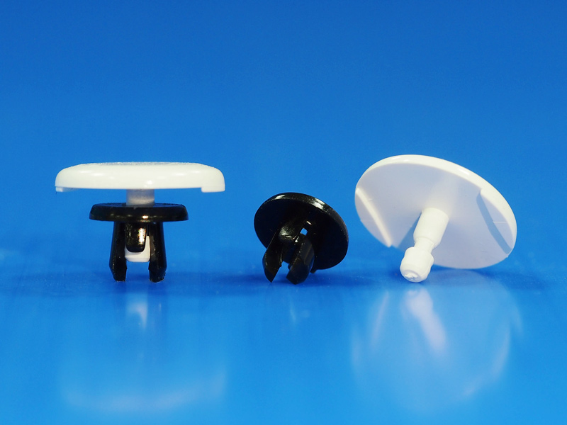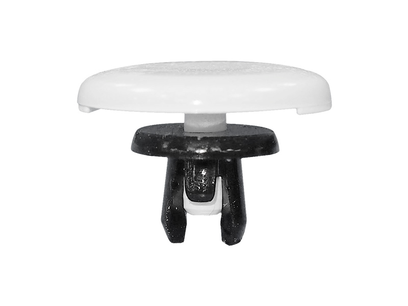 Push In Rivet. Polycarbonate. Color White/Black. Hole diameter Ø 3.5mm. Panel Thickness 1.6-2.4mm. The grommet expands as the pin is inserted, creating a secure fit.