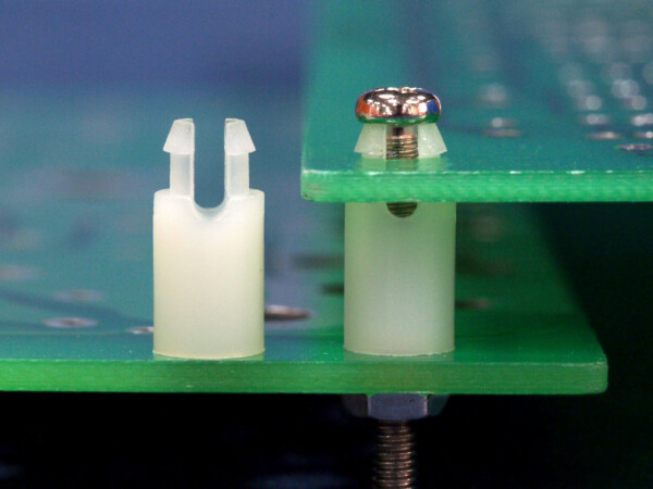 Self retaining spacers are used to insulate the heads of screws on a printed circuit board, while providing the desired spacing between the chassis and the PCB. Spacer length is 9.5 mm.