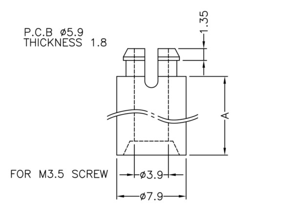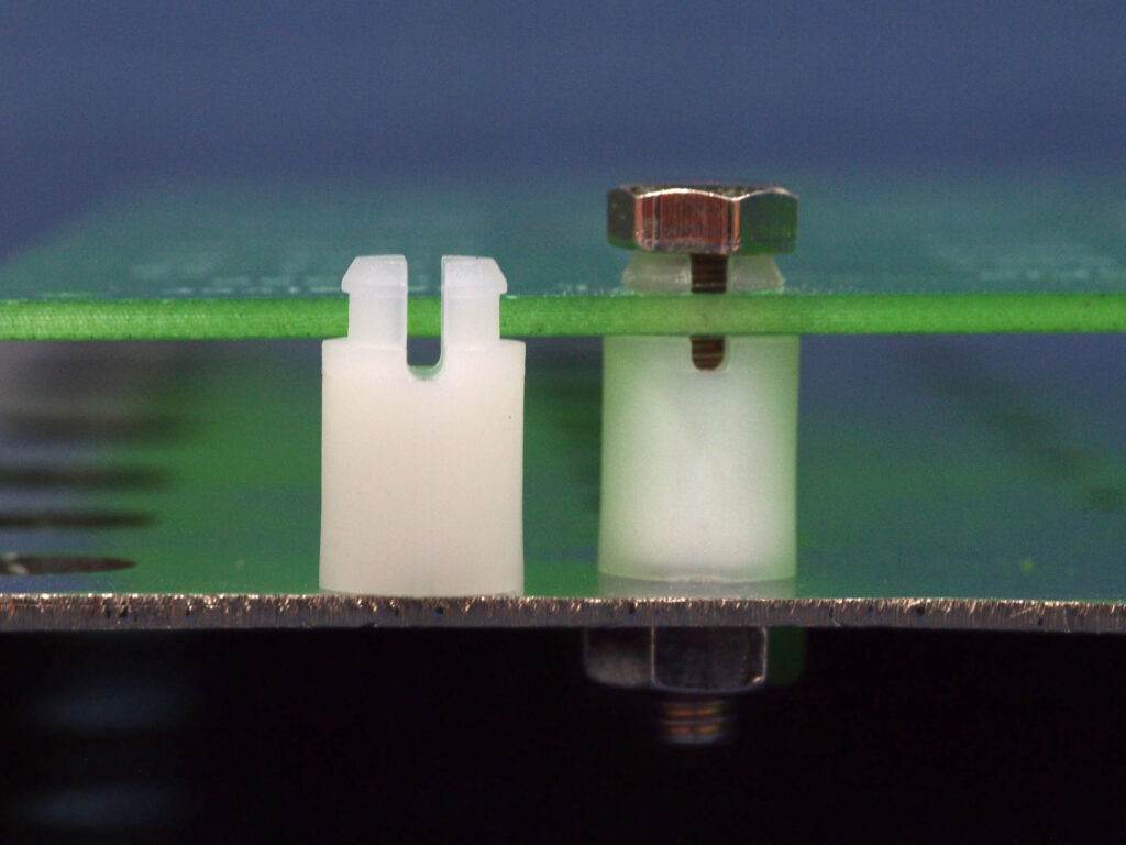 Self retaining spacers are used to insulate the heads of screws on a printed circuit board, while providing the desired spacing between the chassis and the PCB. Spacer length is 9.5 mm.