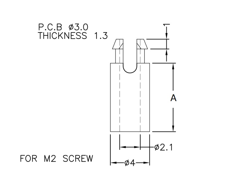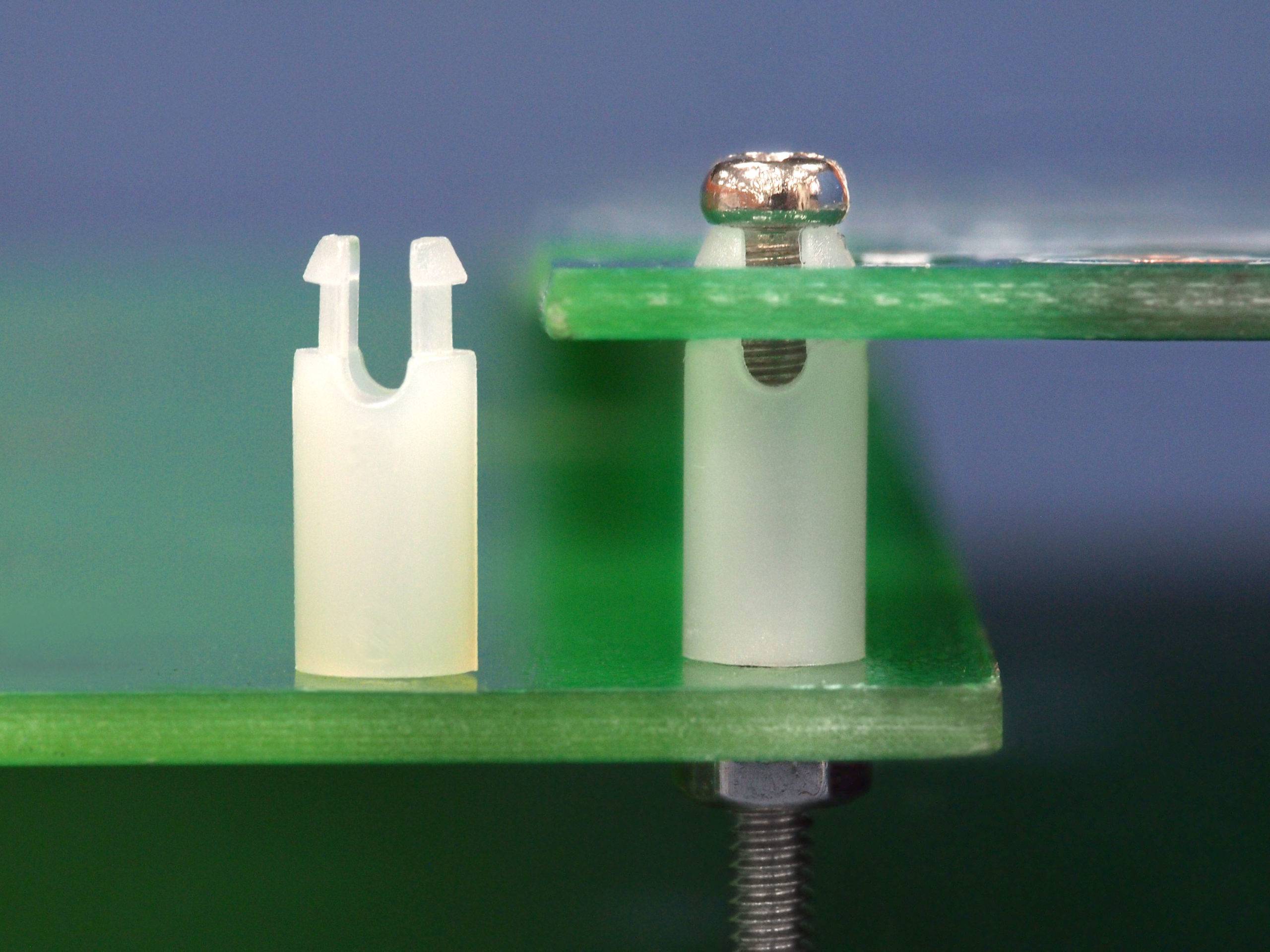 Self retaining spacers are used to insulate the heads of screws on a printed circuit board, while providing the desired spacing between the chassis and the PCB. Spacer length is 7 mm.