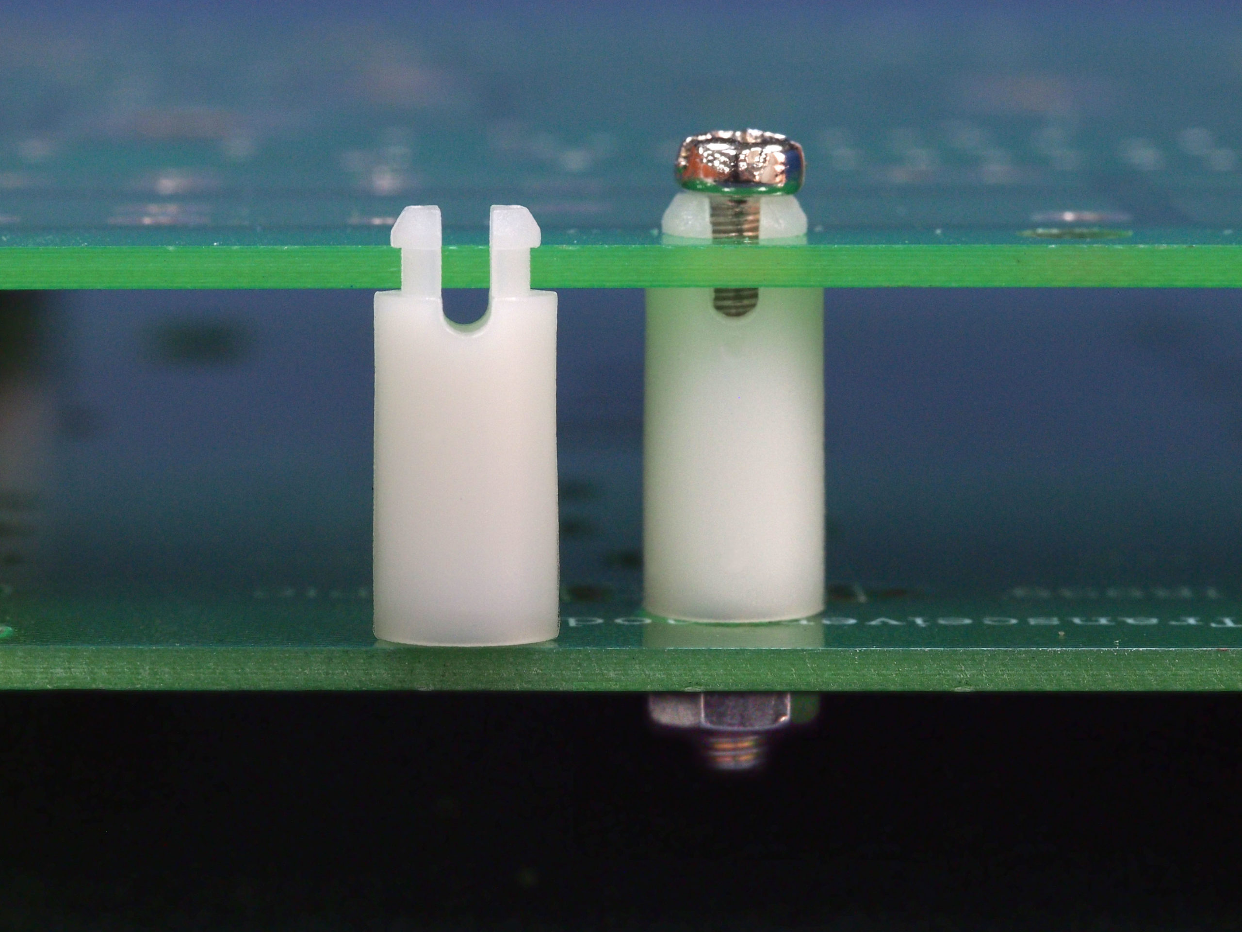 Self retaining spacers are used to insulate the heads of screws on a printed circuit board, while providing the desired spacing between the chassis and the PCB. Spacer length is 12.7 mm.