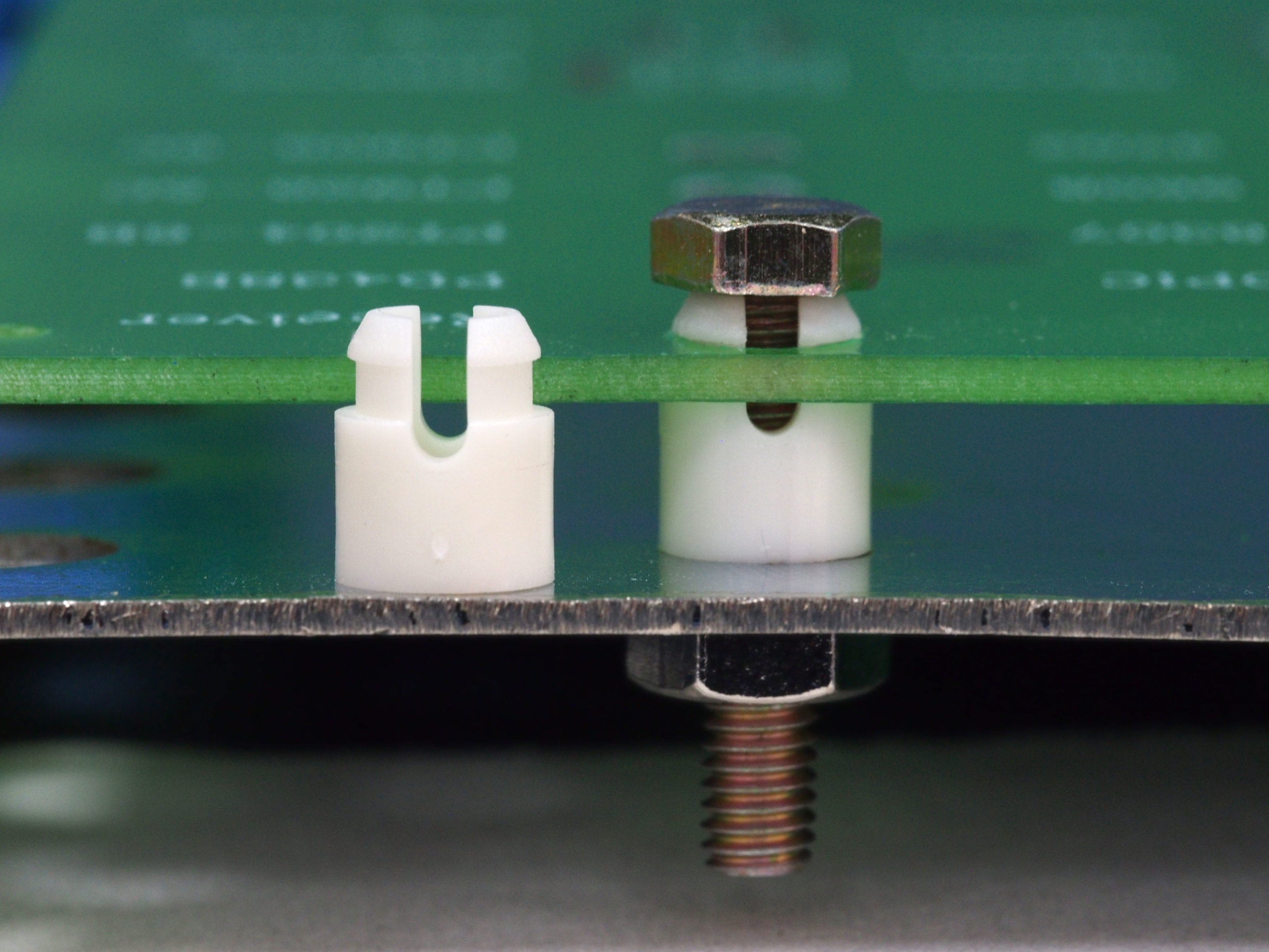 Self retaining spacers are used to insulate the heads of screws on a printed circuit board, while providing the desired spacing between the chassis and the PCB. Spacer length is 5.5 mm.