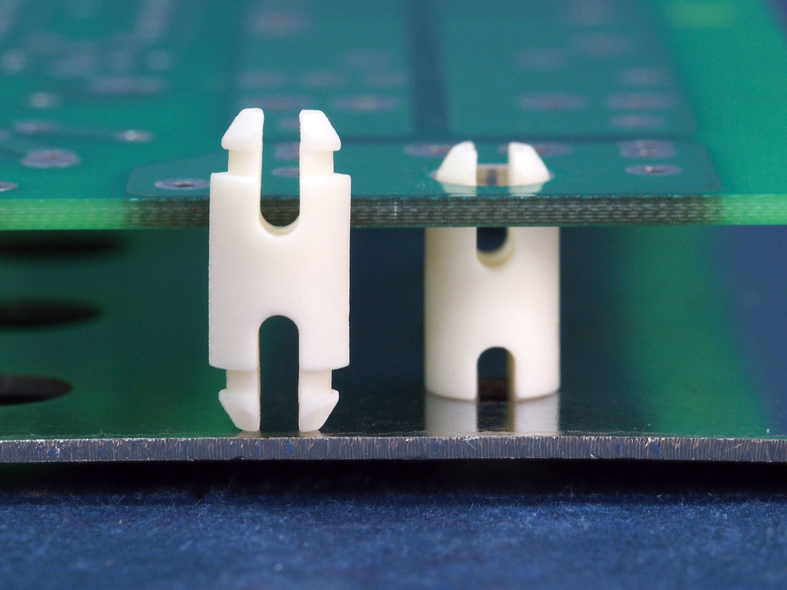 Dual locking support post. A two prong snap lock fits a top and bottom hole of 5.2 mm. Spacer length is 9.6 mm.