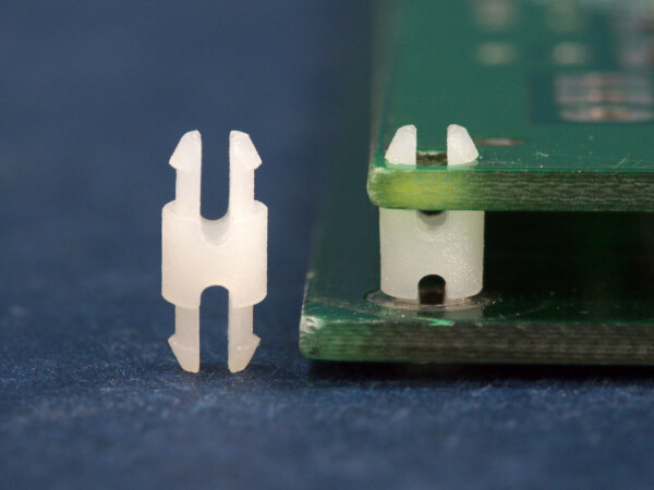 Support post for a panel top and bottom hole of 4 mm with a two prong snap lock. Spacer length is 16.5 mm.