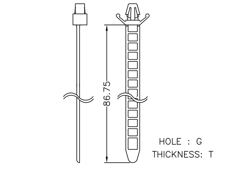 Round adjustable Lock Wire Clip with slider mechanism for securing an IEC AC power connector to a Chassis Push-Mount strap. Material Nylon 66. Color Black. Prevents accidental disconnection of the cord