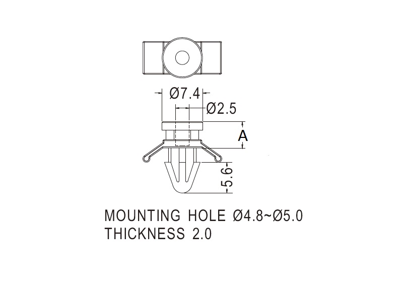 Snap lock spacer provided with a pilot hole of 2.5 mm an arrowhead with tension wings for a 4.8~5 mm mounting hole. Spacer length is 4.8 mm.