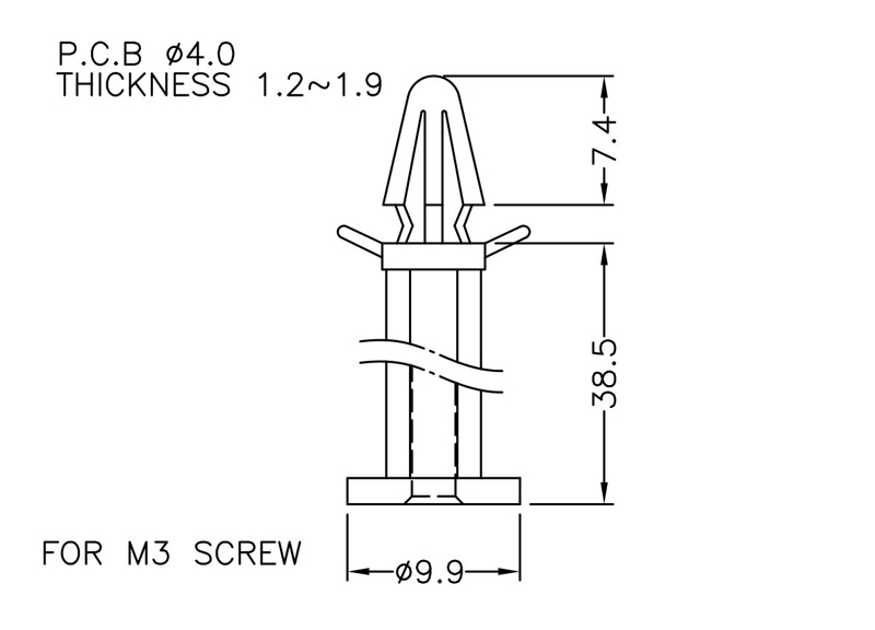 Snap fit spacer with tension wing for a 4 mm panel hole equipped at the chassis side with a pilot hole of 2.5 mm for an M3 self tapping screw. Standoff height is 38.5 mm.