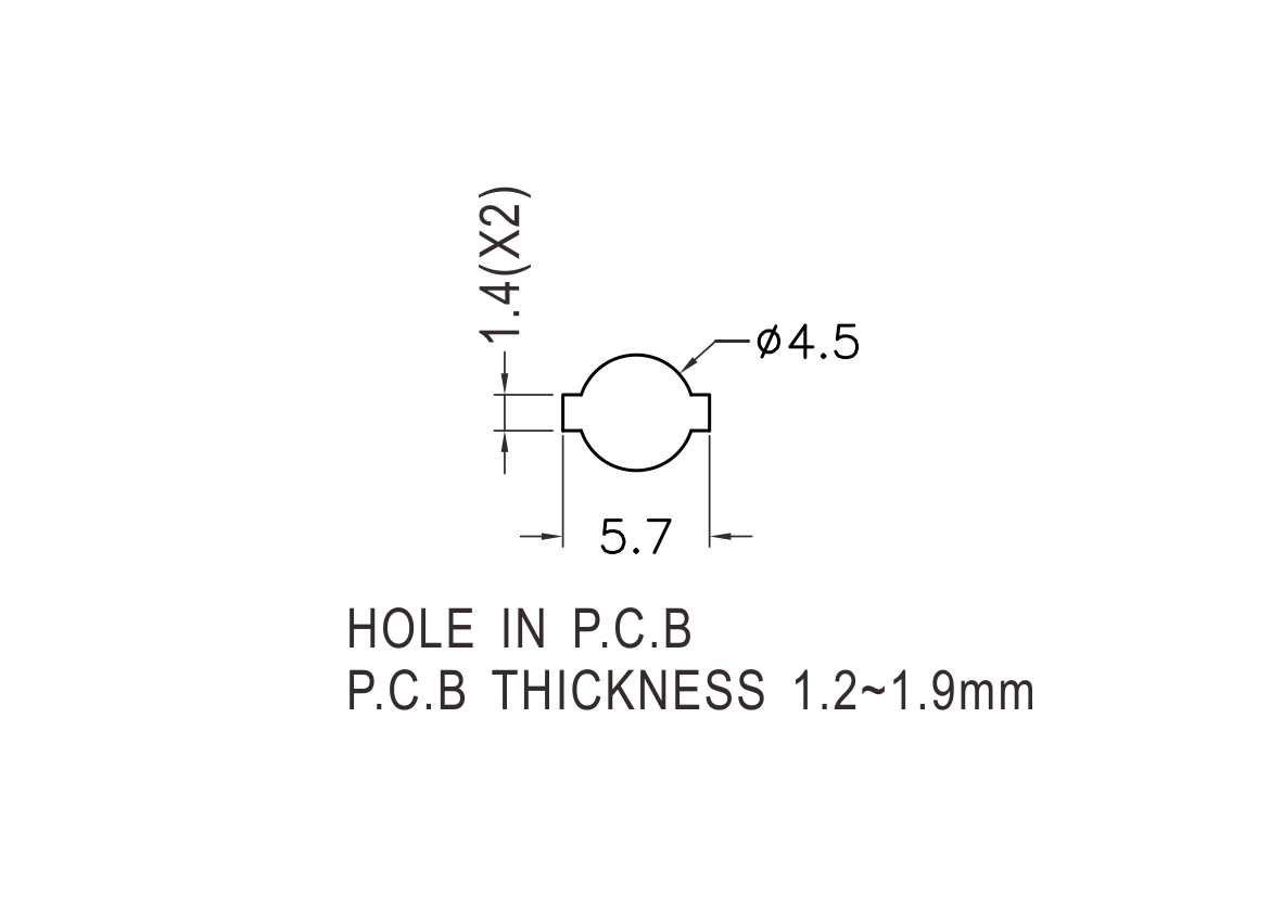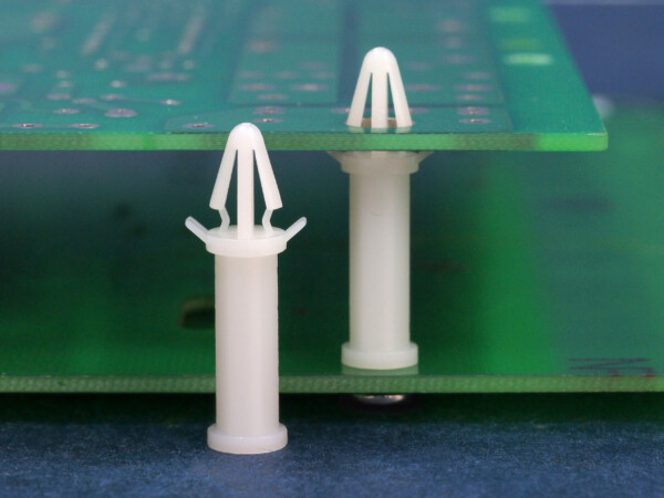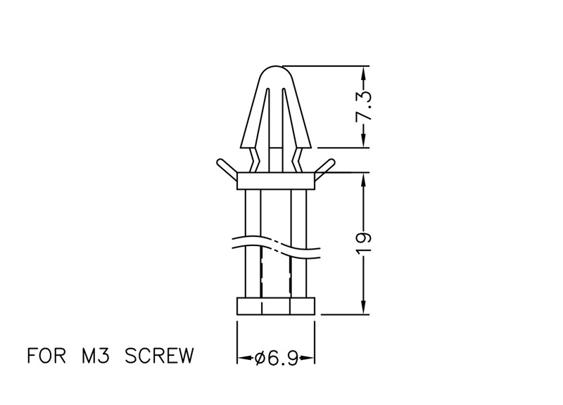 Snap fit spacer with tension wing for a 4.5 mm panel hole equipped at the chassis side with a pilot hole of 2.5 mm for an M3 self tapping screw. Spacer length is 19 mm.