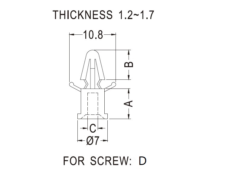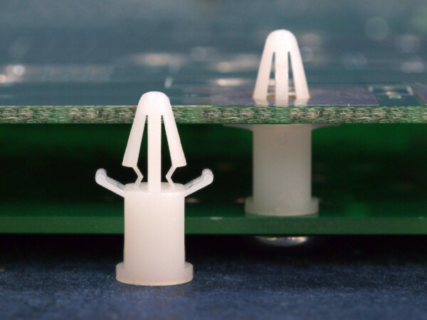 Snap fit spacer with tension wing for a 4 mm panel hole equipped at the chassis side with a pilot hole. Spacer length is 8.5 mm.