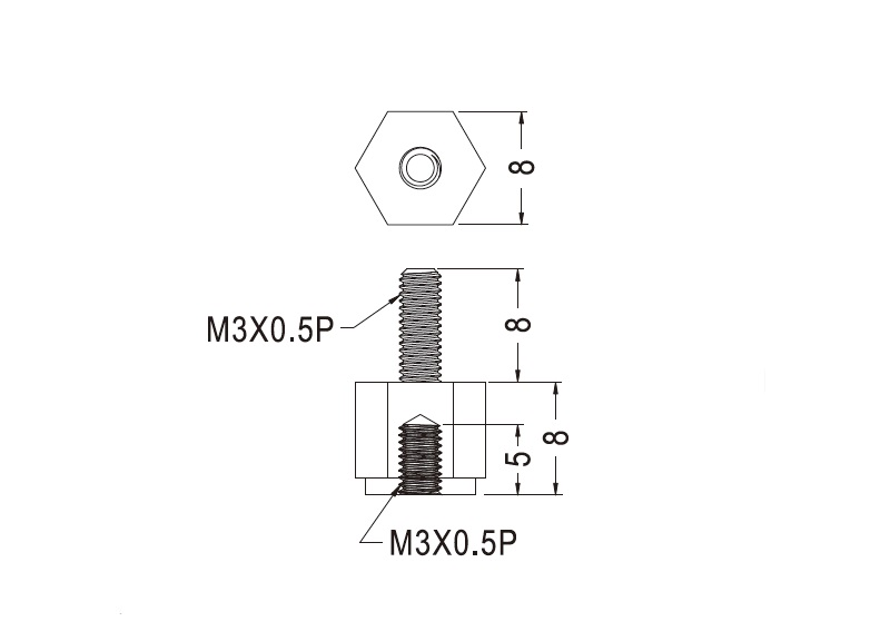 M3 hexagonal nylon spacer; male/female. Spacer body length is 8 mm.