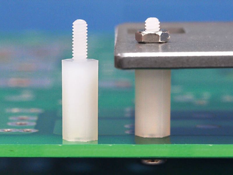 M2 metric hexagonal nylon spacer; Male/Female. Spacer body length is 6.5 mm.