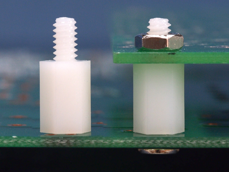 UNC 6-32 hexagonal nylon spacer; male/female. Spacer body length is 25.4 mm.