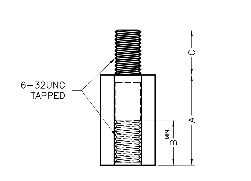 UNC 6-32 hexagonal nylon spacer; Male/Female. Spacer body length is 31.8 mm.