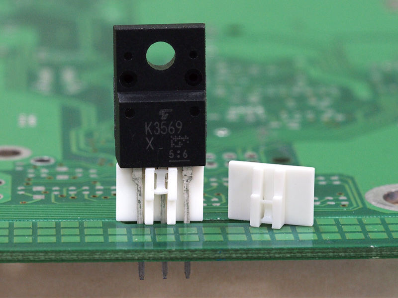 Rectangular Spacer for 3 leads Power Transistors. Height 2.4mm. Material PBT. Color Natural. This mount is ideal for insulating and protecting the lead wires of power MOSFETs, IGBTs and diodes.