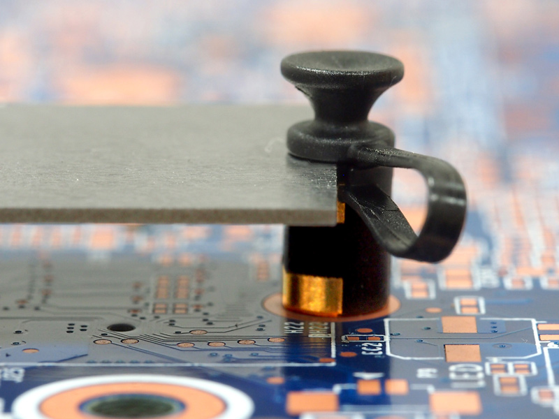 M.2 (NGFF)conductive board Spacer Snap In Mounting Retention Clip . Height 6.5mm. Mounting Hole Thickness 1.6mm. Material Nylon 66. Color Natural/Black.Conductive, protection against EMI