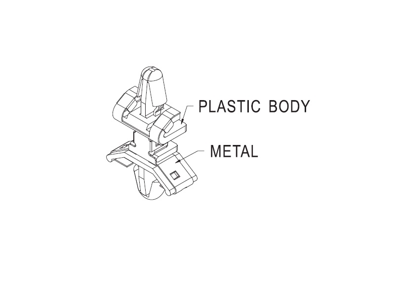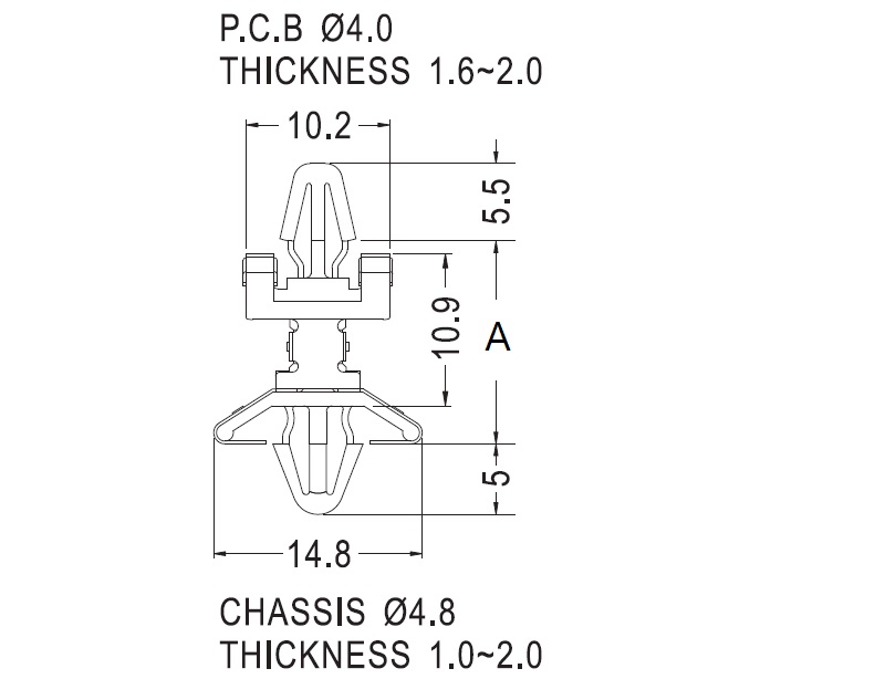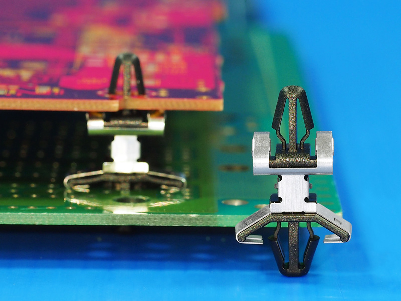Conductive dual locking support post, arrowhead fix for a top hole of 4 mm and arrowhead fix with tension wing for 4.8 mm bottom hole. Spacer length is 14.4 mm.
