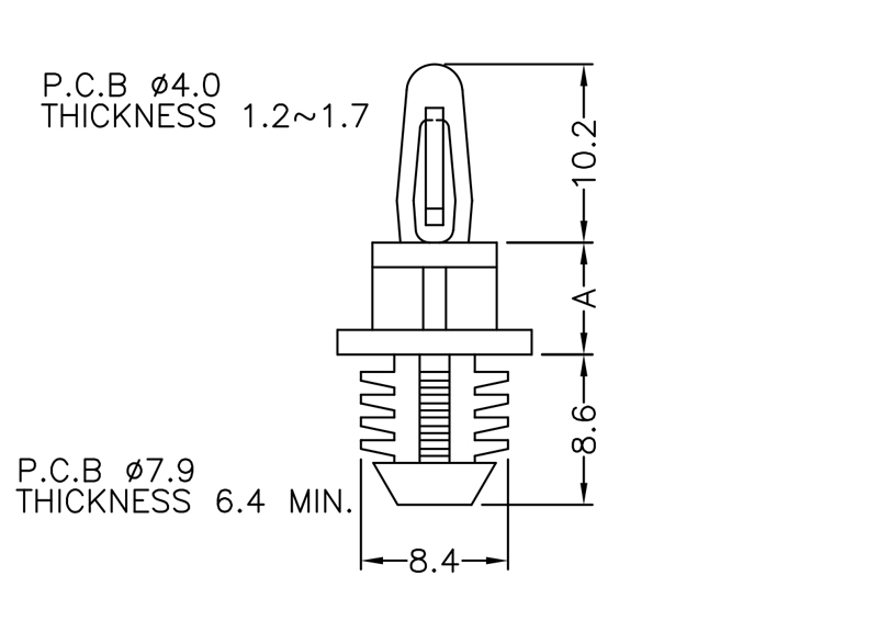 This blind hole circuit board spacer will press-fit into a 7.9 mm round threaded, punched or drilled hole. The bayonet head fit a 4 mm hole. Spacer length is 19.1 mm.