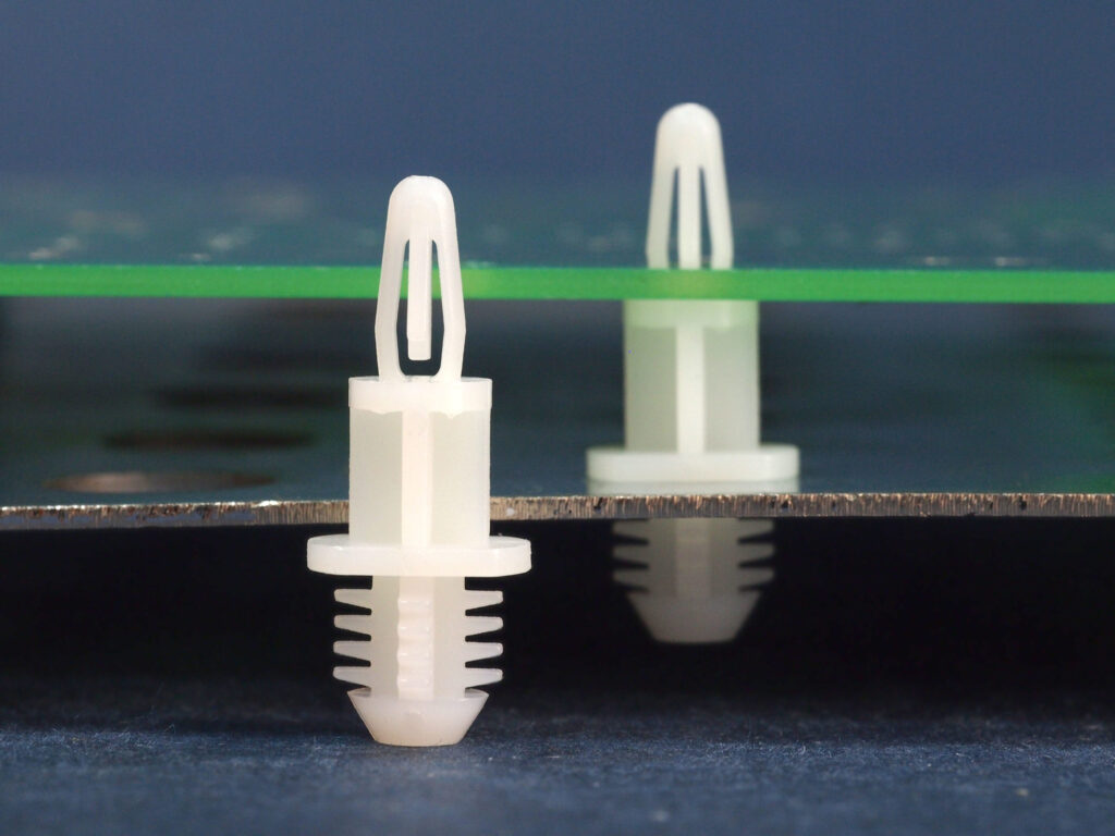 This blind hole circuit board spacer will press-fit into a 7.9 mm round threaded, punched or drilled hole. The bayonet head fit a 4 mm hole. Spacer length is 9.5 mm.