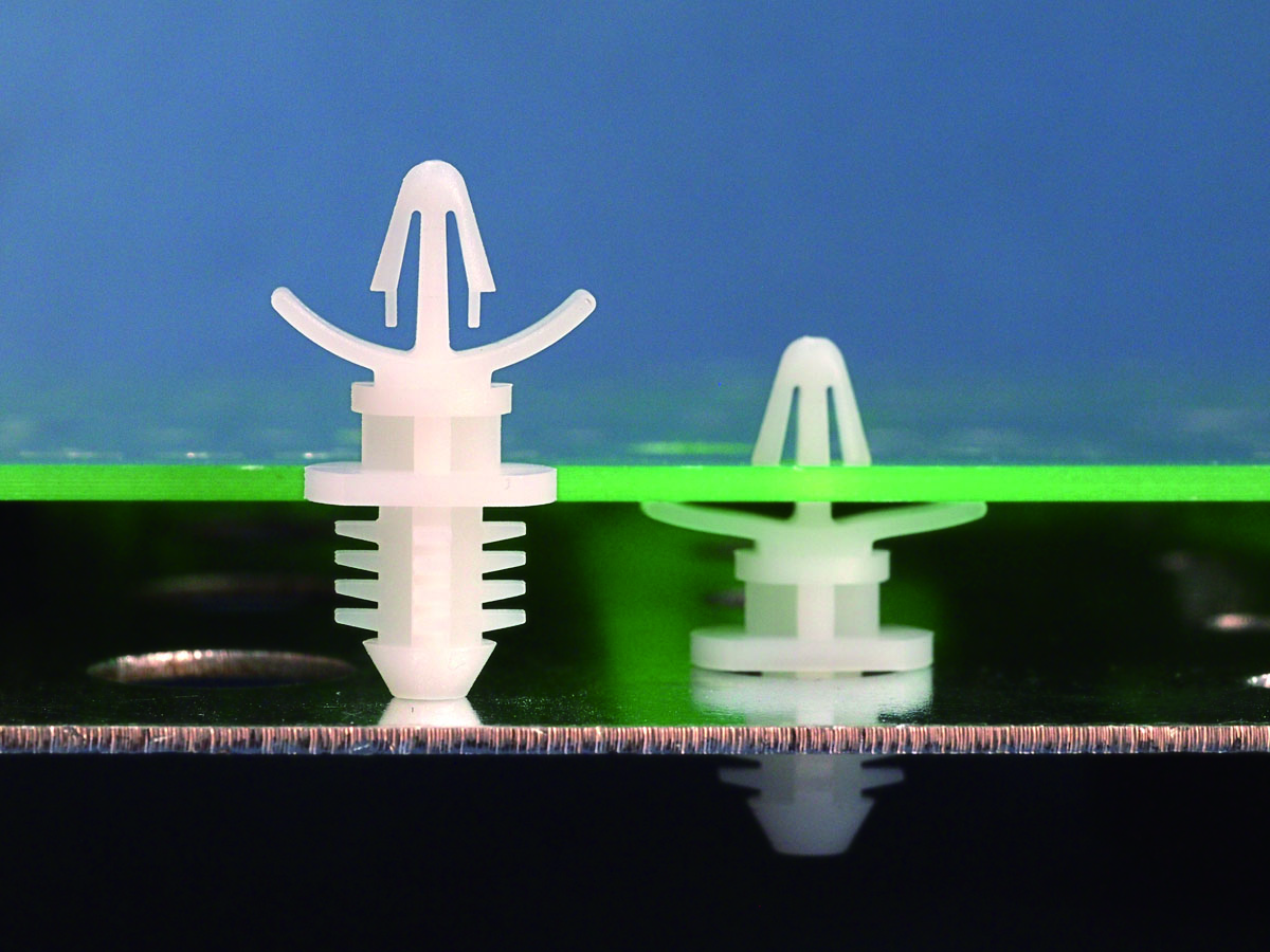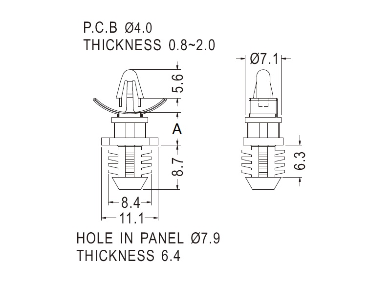 This blind hole circuit board spacer will press-fit into a 7.9 mm round threaded, punched or drilled holes. The winged arrowhead fits a 4 mm hole. Spacer length is 6.4 mm.