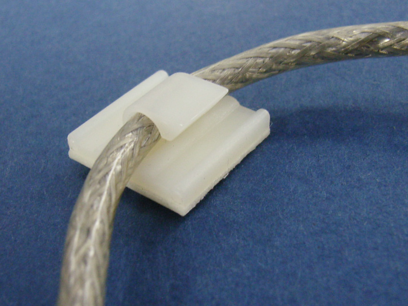 Adhesive Mount 16.0×15.6mm Round Wire Clip Side Entry. Holding dia. Ø4.4mm. Material Nylon 66. Available in Natural or Black